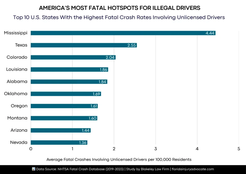 The research analyzed fatal crash data involving unlicensed drivers from 2019 to 2023 across the U.S. states, via the NHTSA database. Using population estimates from the U.S. Census Bureau, the study calculated fatal crash rates per 100,000 residents to determine the states with the highest crash risks.